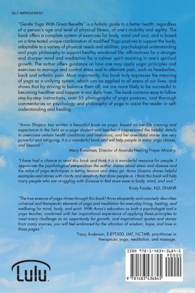 "Gentle Yoga With Great Benefits" is a holistic guide to a better health, regardless of a person's age and level of physical fitness, of one's mobility and agility. The book offers a complete system of exercises for body, mind and soul, and is based on a time tested unique combination of modified Yoga postures to support the body, adaptable to a variety of physical needs and abilities; psychological understanding and yogic philosophy to support healthy emotional life; affirmations for a stronger and sharper mind and meditation for a calmer spirit assisting in one's spiritual growth. The author offers guidance on how one may apply yogic principles and exercises to manage and control stress and to alleviate pain, such as headaches, back and arthritic pain.
