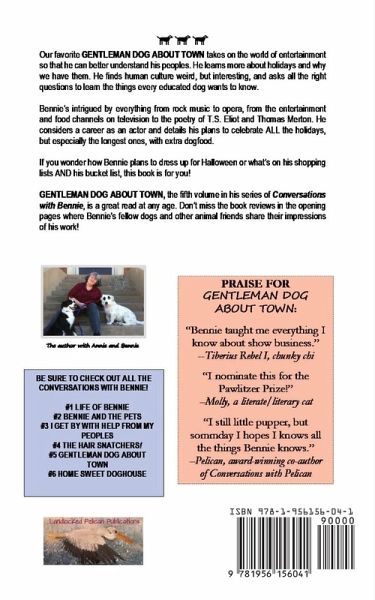 Our favorite GENTLEMAN DOG ABOUT TOWN takes on the world of entertainment so that he can better understand his peoples. He learns more about holidays and why we have them. He finds human culture weird, but interesting, and asks all the right questions to learn the things every educated dog wants to know. Bennie's intrigued by everything from rock music to opera, from the entertainment and food channels on television to the poetry of T.S. Eliot and Thomas Merton. He considers a career as an actor and details his plans to celebrate ALL the holidays, but especially the longest ones, with extra dogfood. If you wonder how Bennie plans to dress up for Halloween or what's on his shopping lists AND his bucket list, this book is for you! GENTLEMAN DOG ABOUT TOWN, the fifth volume in his series of Conversations with Bennie, is a great read at any age. Don't miss the book reviews in the opening pages where Bennie's fellow dogs and other animal friends share their impressions of his work!