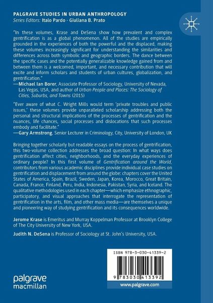 Chapter 1: Introduction.-The Americas.-Chapter 2: Brooklyn Revisited: From Blight to Gentrification.-Chapter 3: Gentrification and Ageing in Montreal, Quebec: Housing Insecurity and Displacement Among Older Tenants.-Chapter 4: Forced Removals in Gentrifying Rio de Janeiro and San Francisco: Experiencing Displacement.-Europe.-Chapter 5: Vernacular Gentrification in Malasaña, Madrid.-Chapter 6: "Community Devastation Project:" .-Visualising the Contrary Logics of 'Regeneration' through Collaborative Arts Practice-based Research.-Chapter 7: Visualizing Gentrification in Ancoats, Manchester: A Multi Method Approach to Mapping Change.-Chapter 8: "We're not Moving:" Solidarity and Collective Housing Struggle in a Changing Sweden.-Chapter 9: Pacifying La Goutte d'or, Getting Paris more French: Grounding Gentrification in a Cosmopolitan Neighborhood.-Middle East and Far East.-Chapter 10: Residential Transformations leading to Gentrification: Cases from Istanbul.-Chapter 11: Tourism Gentrification of the Old City of Damascus.-Chapter 12: When Ideology Replaces the Market: Gentrification in East Jerusalem.-Chapter 13: Gentrification, Machizukuri, and Ontological Insecurity: Bottom-Up Redevelopment and the Cries of Residents in Kamagasaki, Osaka.