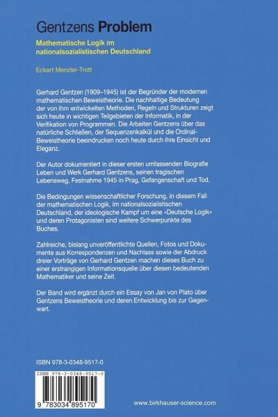 Gerhard Gentzen (1909-1945) ist der Begründer der modernen mathematischen Beweistheorie. Die nachhaltige Bedeutung der von ihm entwickelten Methoden, Regeln und Strukturen zeigt sich heute in wichtigen Teilgebieten der Informatik, in der Verifikation von Programmen. Die Arbeiten Gentzens über das natürliche Schliessen, der Sequenzenkalkül und die Ordinal-Beweistheorie beeindrucken noch heute durch ihre Einsicht und Eleganz. Der Autor dokumentiert in dieser ersten umfassenden Biografie Leben und Werk Gerhard Gentzens, seinen tragischen Lebensweg, Festnahme 1945 in Prag, Gefangenschaft und Tod. Die Bedingungen wissenschaftlicher Forschung, in diesem Fall der mathematischen Logik, im nationalsozialistischen Deutschland, den ideologischen Kampf um eine "Deutsche Logik" und deren Protagonisten ist ein weiterer Schwerpunkt des Buches. Zahlreiche, bislang unveröffentlichte Quellen, Fotos und Dokumente aus Korrespondenzen und Nachlass sowie der Abdruck dreier Vorträge von Gerhard Gentzen machen dieses Buch zu einer erstrangigen Informationsquelle über diesen bedeutenden Mathematiker und seine Zeit. Der Band wird ergänzt durch ein Essay von Jan von Plato über Gentzens Beweistheorie und deren Entwicklung bis zur Gegenwart.