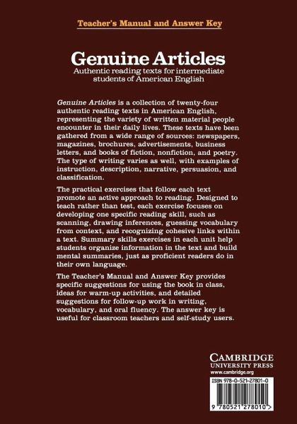 Authentc reading texts for intermediate students of American English. The Teacher's Manual provides specific guidance for using the book in class; ideas for warm-up activities; detailed suggestions for follow-up work in writing; vocabulary and oral fluency; and an answer key.