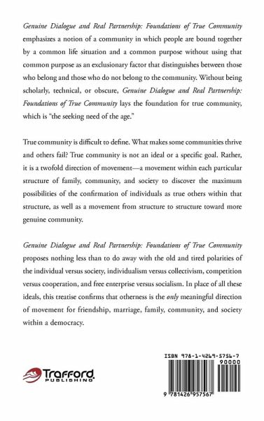 Building Genuine Community emphasizes a notion of a community in which people are bound together by a common life situation and a common purpose without using that common purpose as an exclusionary factor that distinguishes between those who belong and those who do not belong to the community. Without being scholarly, technical, or obscure, Building Genuine Community lays the foundation for true community, which is "the seeking need of the age." True community is difficult to define. What makes some communities thrive and others fail? True community is not an ideal or a specific goal. Rather, it is a twofold direction of movement-a movement within each particular structure of family, community, and society to discover the maximum possibilities of the confirmation of individuals as true others within that structure, as well as a movement from structure to structure toward more genuine community. Building Genuine Community proposes nothing less than to do away with the old and tired polarities of the individual versus society, individualism versus collectivism, competition versus cooperation, and free enterprise versus socialism. In place of all these ideals, this treatise confirms that otherness is the only meaningful direction of movement for friendship, marriage, family, community, and society within a democracy.