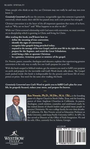 Many people who think or say they are Christians may not really be and may not even know it. Genuinely Converted spells out the concrete, recognizable signs that someone is genuinely converted, which means their old life has passed away and a new person has emerged. Christian conversion is at the heart of the all-important questions that many of us have, such as "Why are we here?" and "What happens to us after we die?" While our Christ-centered relationship with God starts with conversion, we must continue on to discipleship which is growing in Christ and living for Christ. After reading this book, you'll know how to: · define the meaning of true conversion; · identify the signs of conversion; · recognize false gospels being preached today; · respond to the message of the true Gospel, and stir your life in the right direction; · prepare for the Rapture, and avoid the Great Tribulation; · avoid being a fake or apostate Christian; · be a genuine, victorious pastor or minister of the gospel. Dr. Nworie, pastor, counselor, theologian and educator, explains that experiencing genuine conversion is the only way to really live out God's purpose for your life. With this book steeped in biblical wisdom, get the answers you need to fulfill your purpose on earth and prepare for the inevitable end God's Word clearly talks about. The Gospel truth packed inside this book is indispensable for the present and future life of every person or priest. You won't be the same after reading this book. Genuinely Converted uses God's Word to guide you to fulfill God's plan for your life, be properly focused, reduce your stress, and prepare for heaven.