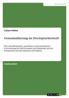 Studienarbeit aus dem Jahr 2025 im Fachbereich Germanistik - Linguistik, Note: 2,0, Universität Münster (Germanistisches Institut, Abteilung Sprachwissenschaft), Veranstaltung: Seminar - Zweitspracherwerb und kontrastive Linguistik, Sprache: Deutsch, Abstract: Die vorliegende Arbeit untersucht den Erwerb der Genusmarkierung im Deutschen bei mehrsprachigen Grundschulkindern mit den Erstsprachen Deutsch, Russisch und Türkisch. Anhand eines schriftsprachlichen Korpus aus 180 Texten von 65 Kindern werden Genuszuweisung und -kongruenz kontrastiv und quantitativ analysiert. Die Auswertung erfolgt hypothesengeleitet und stützt sich auf das Konzept der Crosslinguistic Influence (CLI). Die Ergebnisse zeigen: (1) Die Korrektheit der Genusverwendung variiert nach Erstsprachhintergrund (L1 Deutsch¿>¿L1 Russisch¿>¿L1 Türkisch). (2) Genuszuweisungen gelingen häufiger als Kongruenzleistungen. (3) Neutralisierungsfehler treten zwar auf, sind jedoch nicht der dominierende Fehlertyp. Die Arbeit verdeutlicht, dass der Erwerb des Genus ein mehrdimensionaler Prozess ist, der maßgeblich von der sprachstrukturellen Vorprägung der L1 beeinflusst wird, und liefert Implikationen für Forschung und DaZ-Didaktik.