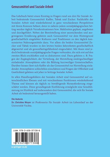 Das Lehrbuch bietet einen Einstieg in Fragen rund um drei für Soziale Arbeit bedeutende Genussmittel: Kaffee, Tabak und Zucker. Fachkräfte der Sozialen Arbeit sind wiederkehrend in ganz verschiedenen Perspektiven mit ihrem Konsum befasst. Neben gesundheitsbezogenen Fragen aufgrund der gesellschaftlichen Ächtung von (zu viel) Zucker und Tabak lassen sich an ihnen bedeutende sozialpädagogische Fragen aufmachen, die jenseits gesundheitsbezogener, z. B. Fragen der Gastlichkeit, der Gestaltung professionell angenehmer Atmosphären, der Verteilung sowie des offenen Zugangs betreffen. In nahezu jedem sozialpädagogischen Setting werden täglich Verzehrsituationen bzw. Mahlzeiten geplant, angeboten und durchgeführt. Für die Soziale Arbeit über die Bereitstellung ausreichender und ausgewogener Ernährung hinaus verantwortlich ist für die Bereitstellung von Genussmitteln und deren Konsum vor dem Hintergrund gesellschaftlich relevanter eingelebter Kulturen und Traditionen. Das Lehrbuch ermöglicht, über den Gesamtzusammenhang von Genussmitteln im Zusammenhang mit Ernährung als grundlegende und voraussetzungsvolle Bedingungen sozialpädagogischen Denkens und Handelns reflektieren zu können. In allen Handlungsfeldern der Sozialen Arbeit sind Genussmittel auf unterschiedlichen Ebenen und mit verschiedenen Funktionen wiederkehrend Thema und können als täglich zu bewältigende Herausforderung eingeschätzt werden. Diese grundlegende Einführung ermöglicht eine Bewusstmachung und damit auch fachliche Reflexionsmöglichkeiten für den individuellen und gesellschaftlich verantwortlichen sozialpädagogischen Umgang von Fachkräften mit Fragen rund um die insbesondere für Soziale Arbeit bedeutenden Genussmittel Kaffee, Tabak und Zucker.
