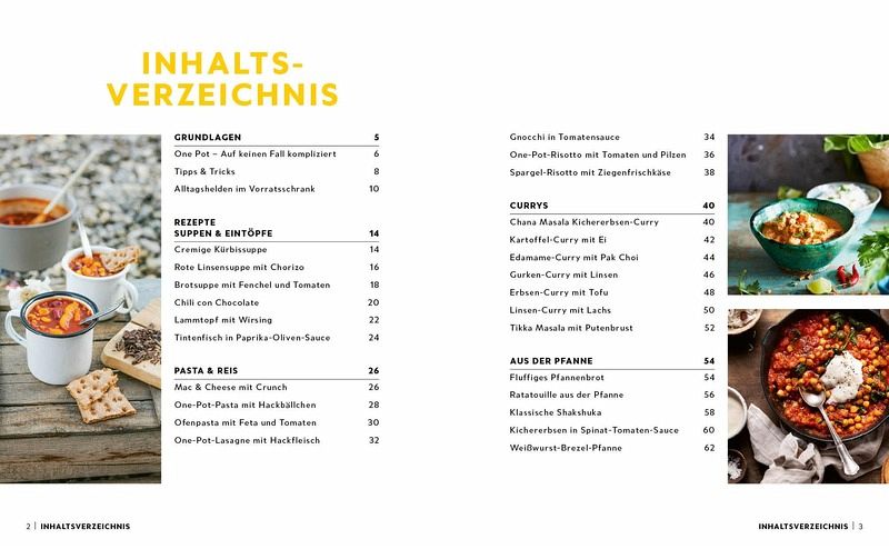 Ob einen dampfenden Wirsing-Lamm-Eintopf für Regentge, schnelles One-Pot-Risotto oder pikantes Kichererbsen-Curry, hier ist für jeden Geschmack und jede Lebenslage das passende Rezept dabei! Neben Fleisch und Fisch finden auch Liebhabger vegetarischer und veganer Wohlfühlküche ihre neuen One-Pot-Lieblinge.