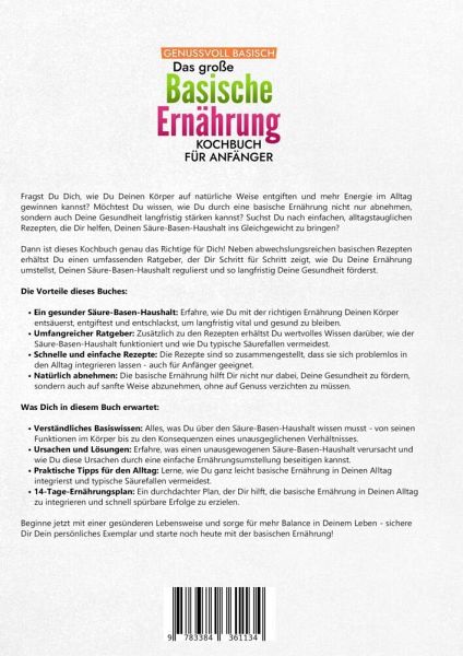 Fragst Du Dich, wie Du Deinen Körper auf natürliche Weise entgiften und mehr Energie im Alltag gewinnen kannst? Möchtest Du wissen, wie Du durch eine basische Ernährung nicht nur abnehmen, sondern auch Deine Gesundheit langfristig stärken kannst? Suchst Du nach einfachen, alltagstauglichen Rezepten, die Dir helfen, Deinen Säure-Basen-Haushalt ins Gleichgewicht zu bringen?Dann ist dieses Kochbuch genau das Richtige für Dich! Neben abwechslungsreichen basischen Rezepten erhältst Du einen umfassenden Ratgeber, der Dir Schritt für Schritt zeigt, wie Du Deine Ernährung umstellst, Deinen Säure-Basen-Haushalt regulierst und so langfristig Deine Gesundheit förderst.Die Vorteile dieses Buches:- Ein gesunder Säure-Basen-Haushalt: Erfahre, wie Du mit der richtigen Ernährung Deinen Körper entsäuerst, entgiftest und entschlackst, um langfristig vital und gesund zu bleiben.- Umfangreicher Ratgeber: Zusätzlich zu den Rezepten erhältst Du wertvolles Wissen darüber, wie der Säure-Basen-Haushalt funktioniert und wie Du typische Säurefallen vermeidest.- Schnelle und einfache Rezepte: Die Rezepte sind so zusammengestellt, dass sie sich problemlos in den Alltag integrieren lassen - auch für Anfänger geeignet.- Natürlich abnehmen: Die basische Ernährung hilft Dir nicht nur dabei, Deine Gesundheit zu fördern, sondern auch auf sanfte Weise abzunehmen, ohne auf Genuss verzichten zu müssen.Was Dich in diesem Buch erwartet:- Verständliches Basiswissen: Alles, was Du über den Säure-Basen-Haushalt wissen musst - von seinen Funktionen im Körper bis zu den Konsequenzen eines unausgeglichenen Verhältnisses.- Ursachen und Lösungen: Erfahre, was einen unausgewogenen Säure-Basen-Haushalt verursacht und wie Du diese Ursachen durch eine einfache Ernährungsumstellung beseitigen kannst.- Praktische Tipps für den Alltag: Lerne, wie Du ganz leicht basische Ernährung in Deinen Alltag integrierst und typische Säurefallen vermeidest.- 14-Tage-Ernährungsplan: Ein durchdachter Plan, der Dir hilft, die basische Ernährung in Deinen Alltag zu integrieren und schnell spürbare Erfolge zu erzielen.Beginne jetzt mit einer gesünderen Lebensweise und sorge für mehr Balance in Deinem Leben - sichere Dir Dein persönliches Exemplar und starte noch heute mit der basischen Ernährung!