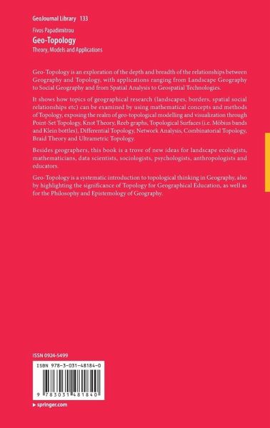 It shows how topics of geographical research (landscapes, borders, spatial social relationships etc) can be examined by using mathematical concepts and methods of Topology, exposing the realm of geo-topological modelling and visualization through Point-Set Topology, Knot Theory, Reeb graphs, Topological Surfaces (i.e. Möbius bands and Klein bottles), Differential Topology, Network Analysis, Combinatorial Topology, Braid Theory and Ultrametric Topology.