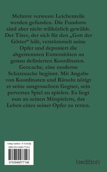 Nadine und Thomas J. sind die stolzen Besitzer eines Landgasthofes mit einem kleinen Hotel inmitten des fränkischen Landkreises Neustadt an der Aisch. In ihrer knapp bemessenen Freizeit frönen sie gerne ihrem Hobby, dem Geocaching. Thomas findet einen Brief, von der offiziellen deutschen Plattform Opencaching Deutschland e.V, im Briefkasten. Sie werden höflich dazu aufgefordert, einen speziellen Geocache zu absolvieren. Voller Vorfreude machen sich die Beiden, ausgestattet mit GPS-System, auf die Suche zu den genannten Koordinaten. Ihre Freude sollte bald ein jähes Ende finden. Am Zielort finden sie in einem Maisfeld eine Holzkiste, in der sich das abgetrennten Bein einer jungen Frau, sowie ein Zettel mit weiteren Anweisungen des Täters befinden. Er verlangt die Mitnahme des Fundes und bezeichnet sich selbst als den Gott der Götter . Drei Opfer sind in seiner Gewalt. Er bezeichnet seine Opfer als Vergangenheit , Gegenwart und Zukunft . Nadine und Thomas müssen sein perverses Spiel mitspielen, denn er stellt ihnen in Aussicht, eines seiner drei Opfer retten zu können. Nur die Zukunft könnt ihr retten sind seine Worte. Beide fassen den Entschluss seinen Anweisungen zu folgen.