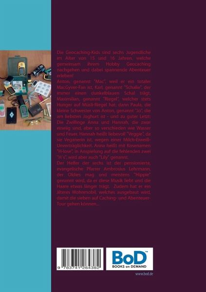 Die sechs Jugendlichen im Alter von 15 und 16 Jahren sind:Anton, genannt "Mac", weil er totaler MacGyver-Fan ist, Karl, genannt "Schalie", weil er immer einen dunkelblauen Schal trägt, Maximilian, genannt "Riegel", weil er stets Hunger auf Müsli-Riegel hat, dann Paula, die kleine Schwester von Anton, genannt "Jo", weil sie am liebsten Joghurt isst - und zu guter Letzt: Die Zwillinge Anna und Hannah, die zwar eineiig sind, aber so verschieden wie Wasser und Feuer. Hannah heißt liebevoll "Veggie", da sie Veganerin ist, wegen einer Milch-Eiweiß-Unverträglichkeit. Anna heißt liebevoll "H-lose", in Anspielung auf die fehlenden zwei "H´s", wird aber auch "Lily" genannt.Der Helfer der sechs ist der pensionierte, evangelische Pfarrer Ambrosius Lehrmann, der Oldies mag und meistens "Hippie" genannt wird, da er diese Musik mag und die Haare etwas länger trägt. Außerdem ist er ein Verschwörungstheoretiker, der damit die sechs öfters zum Verzweifeln bringt. Zudem hat er ein älteres Wohnmobil, welches ausgebaut wird, damit die sieben auf Caching- und Abenteuer-Tour gehen können ...Die Geocaching-Kids ALLGÄU sind sechs Jugendliche, die gemeinsam ihrem Hobby Geocaching nachgehen und dabei immer wieder auf spannende Abenteuer stoßen!