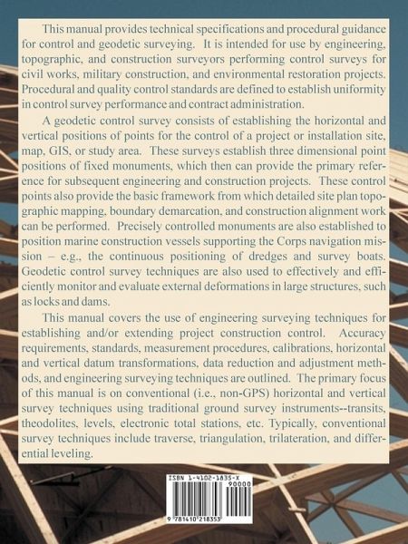 This manual provides technical specifications and procedural guidance for control and geodetic surveying. It is intended for use by engineering, topographic, and construction surveyors performing control surveys for civil works, military construction, and environmental restoration projects. Procedural and quality control standards are defined to establish uniformity in control survey performance and contract administration. A geodetic control survey consists of establishing the horizontal and vertical positions of points for the control of a project or installation site, map, GIS, or study area. These surveys establish three dimensional point positions of fixed monuments, which then can provide the primary reference for subsequent engineering and construction projects. These control points also provide the basic framework from which detailed site plan topographic mapping, boundary demarcation, and construction alignment work can be performed. Precisely controlled monuments are also established to position marine construction vessels supporting the Corps navigation mission - e.g., the continuous positioning of dredges and survey boats. Geodetic control survey techniques are also used to effectively and efficiently monitor and evaluate external deformations in large structures, such as locks and dams. This manual covers the use of engineering surveying techniques for establishing and/or extending project construction control. Accuracy requirements, standards, measurement procedures, calibrations, horizontal and vertical datum transformations, data reduction and adjustment methods, and engineering surveying techniques are outlined. The primary focus of this manual is on conventional (i.e., non-GPS) horizontal and vertical survey techniques using traditional ground survey instruments--transits, theodolites, levels, electronic total stations, etc. Typically, conventional survey techniques include traverse, triangulation, trilateration, and differential leveling.
