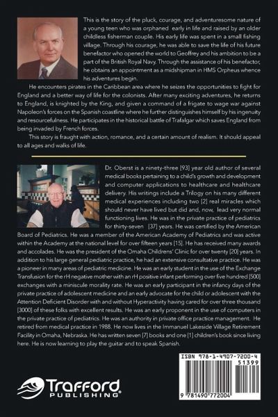 This is the story of the pluck, courage, and adventuresome nature of a young teen who was orphaned early in life and raised by an older childless fisherman couple. His early life was spent in a small fishing village. Through his courage, he was able to save the life of his future benefactor who opened the world to Geoffrey and his ambition to be a part of the British Royal Navy. Through the assistance of his benefactor, he obtains an appointment as a midshipman in HMS Orpheus whence his adventures begin. He encounters pirates in the Caribbean area where he seizes the opportunities to fight for England and a better way of life for the colonists. After many exciting adventures, he returns to England, is knighted by the King, and given a command of a frigate to wage war against Napoleon's forces on the Spanish coastline where he further distinguishes himself by his ingenuity and resourcefulness. He participates in the historical battle of Trafalgar which saves England from being invaded by French forces. This story is fraught with action, romance, and a certain amount of realism. It should appeal to all ages and walks of life.