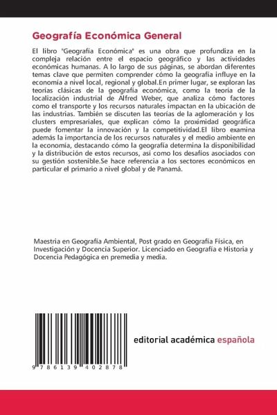 El libro "Geografía Económica" es una obra que profundiza en la compleja relación entre el espacio geográfico y las actividades económicas humanas. A lo largo de sus páginas, se abordan diferentes temas clave que permiten comprender cómo la geografía influye en la economía a nivel local, regional y global.En primer lugar, se exploran las teorías clásicas de la geografía económica, como la teoría de la localización industrial de Alfred Weber, que analiza cómo factores como el transporte y los recursos naturales impactan en la ubicación de las industrias. También se discuten las teorías de la aglomeración y los clusters empresariales, que explican cómo la proximidad geográfica puede fomentar la innovación y la competitividad.El libro examina además la importancia de los recursos naturales y el medio ambiente en la economía, destacando cómo la geografía determina la disponibilidad y la distribución de estos recursos, así como los desafíos asociados con su gestión sostenible.Se hace referencia a los sectores económicos en particular el primario a nivel global y de Panamá.