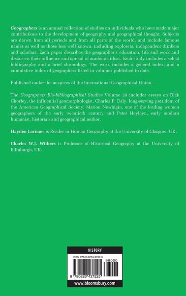The Geographers Bio-bibliographical Series Volume 28 includes essays on Dick Chorley, the influential geomorphologist, Charles P. Daly, long-serving president of the American Geographical Society, Marion Newbigin, one of the leading women geographers of the early twentieth century and Peter Heyleyn, early modern humanist, historian and geographical author.