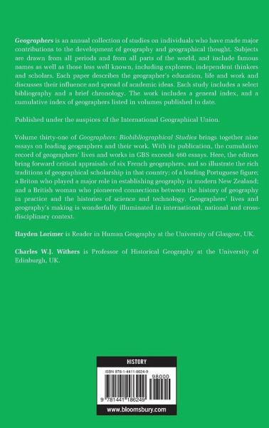 Volume thirty-one of Geographers: Biobibliographical Studies brings together nine essays on leading geographers and their work. With its publication, the cumulative record of geographers' lives and works in GBS exceeds 460 essays. Here, the editors bring forward critical appraisals of six French geographers, and so illustrate the rich traditions of geographical scholarship in that country; of a leading Portuguese figure; a Briton who played a major role in establishing geography in modern New Zealand; and a British woman who pioneered connections between the history of geography in practice and the histories of science and technology. Geographers' lives and geography's making is wonderfully illuminated in international, national and cross-disciplinary context.