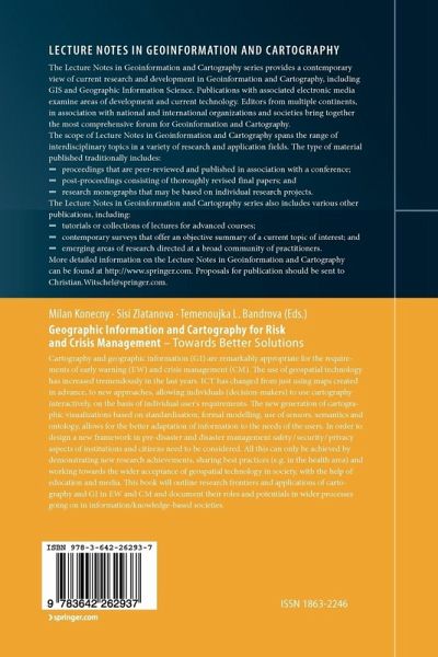 Geoinformation Processing and Modelling.- Earth Observations and Dynamic Mapping: Key Assets for Risk Management.- Spatial Information for Disaster Management Using Examples from IstanbulIstanbul .- Rapid Population Maps for Crisis Response.- Modeling of Spatiotemporal Distribution of Urban Population at High Resolution - Value for Risk Assessment and Emergency Management.- A Framework for Defining a 3D Model in Support of Risk Management.- DB4GeO, a 3D/4D Geodatabase and Its Application for the Analysis of Landslides.- GIS Procedure to Forecast and Manage Woodland Fires.- Cartographic Support of Fire Engine Navigation to Operation Site.- Strategies for the Automatic Extraction of Water Bodies from TerraSAR-X / TanDEM-X data.- GIS Techniques in the Evaluation of Pipeline Networks Seismic Hazard.- Towards a Quick Damage Detection System Based on Grid Computing.- GMES Services for Conflict Prevention and Mitigation: Supporting the DG RELEX in Mission Planning.- Geo-information Services.- Mobilizing Multi-source Geospatial Information for EW and EM: Maximize Sharing, Enhance Flexibility, and Minimize Costs.- Metainformation in Crisis Management Architecture - Theoretical Approaches, INSPIRE Solution.- Collaborative Post-disaster Damage Mapping via Geo Web Services.- Decision Support for Tsunami Early Warning in Indonesia: The Role of OGC Standards.- A Service-Based Architecture for the Interoperability of Heterogeneous Sensor data: A Case Study on Early Warning.- Development of a Coupled Geoinformation and Simulation System for Early Warning.- Multi-criteria Evaluation for Emergency Management in Spatial Data Infrastructures.- Field Tracking Tool: A Collaborative Framework from the Field to the Decision Makers.- Practical Experience with a Contextual Map Service.-Advanced Cartographic Visualisation.- Cartography and Geoinformation for Early Warning and Emergency Management.- Process Support and Adaptive Geovisualisation in Emergency Management.- Perceptions of Various Cartographic Representations Under Specific Conditions.- Research of Students' Cartographical Knowledge in Early Warning and Crisis Management.- Geovisual Analytics Tools for Communicating Emergency and Early Warning.- Kernel Density Estimations for Visual Analysis of Emergency Response Data.- Monitoring and Comparing: A Cartographic Web Application for Real-time Visualization of Hydrological Data.- Designing Map Keys Map Key for Crisis ManagementCrisis Management on the Regional Operational and Informational Centre Level: Monitoring Transport of Dangerous Goods via Contextual Visualisation Contextual Visualization .