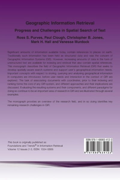 Significant amounts of information available today contain references to places on earth. Traditionally such information has been held as structured data and was the concern of Geographic Information Systems (GIS). However, increasing amounts of data in the form of unstructured text are available for indexing and retrieval that also contain spatial references. This monograph describes the field of Geographic Information Retrieval (GIR) that seeks to develop spatially-aware search systems and support user’s geographical information needs. Important concepts with respect to storing, querying and analysing geographical information in computers are introduced, before user needs and interaction in the context of GIR are explored. The task of associating documents with coordinates, prior to their indexing and ranking forms the core of any GIR system, and different approaches and their implications are discussed. Evaluating the resulting systems and their components, and different paradigms for doing so continue to be an important area of research in GIR and are illustrated through several examples. The monograph provides an overview of the research field, and in so doing identifies key remaining research challenges in GIR.