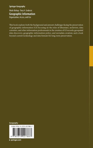 The history and future of geographic information (GI) in the context of big data creates new avenues of concern over its organization, access and use. In this book the authors explore both the background and present challenges facing the preservation of GI, focusing on the roles of librarians, archivists, data scientists, and other information professionals in the creation of GI records for its organization, access, and use.