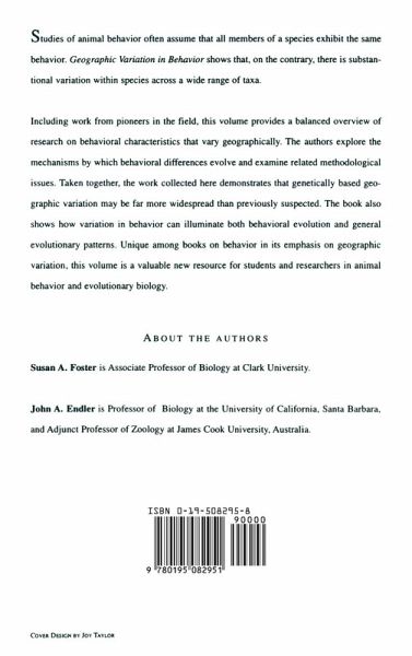 Traditional approaches to the study of animal behavior have most often assumed that all members of a species exhibit the same behavior, termed species-typical behavior. The papers in Geographic Variation in Behavior demonstrate the fallacy of this assumption, providing ample evidence of variation across the ranges of a wide variety of taxa. The contributors have pioneered a variety of approaches to using geographically variable behavioral phenotypes for addressing these evolutionary issues. They summarize advances in the field to date, evaluate the strengths and weaknesses of various approaches, and give a clear and balanced overview of this area. The volume explores some of the richness in phenomena, interpretations, and problems which can arise in studies on this subject.