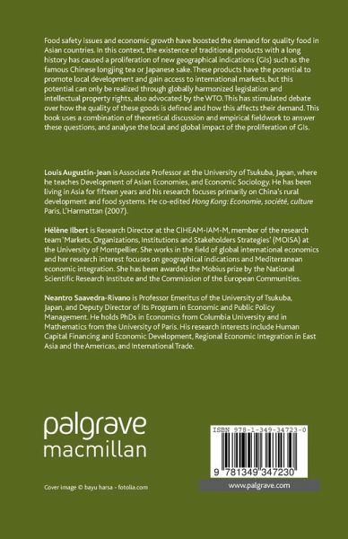 LOUIS AUGUSTIN-JEAN is Associate Professor at the University of Tsukuba, Japan, where he teaches Development of Asian Economies, and Economic Sociology. He has been living in Asia for fifteen years and his research focuses primarily on China's rural development and food systems. He co-edited Hong Kong: Economie, société, culture Paris, L'Harmattan (2007). HÉLÈNE ILBERT is Research Director at the CIHEAM-IAM-M, member of the research team 'Markets, Organizations, Institutions and Stakeholders Strategies' (MOISA) at the University of Montpellier. She works in the field of global international economics and her research interest focuses on geographical indications and Mediterranean economic integration. She has been awarded the Mobius prize by the National Scientific Research Institute and the Commission of the European Communities. NEANTRO SAAVEDRA-RIVANO is Professor Emeritus of the University of Tsukuba, Japan, and Deputy Director of its Program in Economic and Public Policy Management. He holds PhDs in Economics from Columbia University and in Mathematics from the University of Paris. His research interests include Human Capital Financing and Economic Development, Regional Economic Integration in East Asia and the Americas, and International Trade.