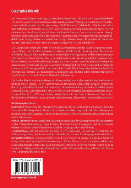 Inga Gryl ist Professorin am Institut für Geographie und am Institut für Sachunterricht an der Universität Duisburg-Essen. Sie forscht zur Professionalisierung von Lehrkräften, Geographie in einer Kultur der Digitalität, Innovativität im Unterricht sowie zur geographischen Bildung in der Primarstufe. Michael Lehner ist wissenschaftlicher Mitarbeiter am Institut für Geographie und Sachunterricht an der Universität Duisburg-Essen. In seiner Promotion in der Geographie und ihrer Didaktik befasst er sich mit dem Potenzial von Kritik in der geographischen Bildung. Tom Fleischhauer arbeitet als Lehrer am Carl-Zeiss-Gymnasium Jena und unterrichtet dort die Fächer Geographie, Geschichte und Sozialkunde. Er ist Autor für Geographie-Lehrbücher. Karl Walter Hoffmann ist Gymnasiallehrer und war ab 2003 für knapp 10 Jahre Fachleiter für Geographie am Staatlichen Studienseminar in Mainz. Bevor er 2012 zum Seminarleiter am Staatlichen Studienseminar für das Lehramt an Gymnasien in Speyer ernannt wurde, hatte er einen Lehrauftrag am Geographischen Institut der Johannes-Gutenberg-Universität Mainz (AG Geographiedidaktik) inne.