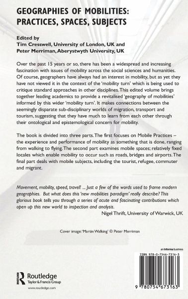 Introduction: geographies of mobility a practices spaces subjects Tim Cresswell and Peter Merriman; Part I Practices: Walking: new forms and spaces for studies of pedestrianism Hayden Lorimer; Running: running as working John Bale; Dancing: the secret slowness of the fast J.D. Dewsbury; Driving: pre-cognition and driving Eric Laurier; Flying: feminisms and mobilities: crusading for aviation in the 1920s Dydia DeLyser. Part II Spaces: Roads: Lawrence Halprin modern dance and the American freeway landscape Peter Merriman; Bridges: different conditions of mobile possibilities Ulf Strohmayer; Airports: terminal/vector Peter Adey; Immigration stations: the regulation and commemoration of mobility at Angel Island San Francisco and Ellis Island New York Gareth Hoskins and Jo Frances Maddern; Cities: moving plugging in floating dissolving David Pinder. Part III Subjects: Commuter: mobility rhythm and commuting Tim Edensor; Tourist: moving places becoming tourist becoming ethnographer Mike Crang; Migrant worker: migrant stories Elizabeth Lee and Geraldine Pratt; The vagrant/vagabond: the curious career of a mobile subject Tim Cresswell; Refugees a performing distinction: paradoxical positionings of the displaced Alison Mountz; Index.