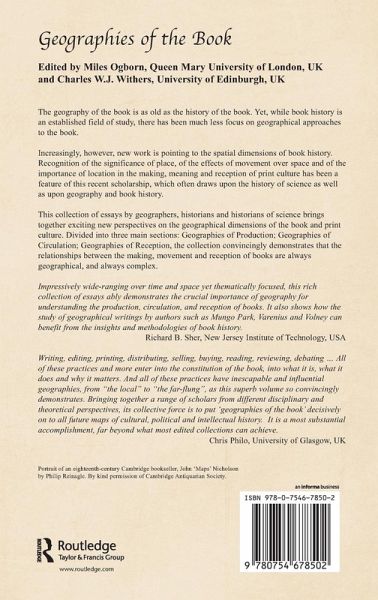 The geography of the book is as old as the history of the book, though far less thoroughly explored. Yet research has increasingly pointed to the spatial dimensions of book history, to the transformation of texts as they are made and moved from place to place, from authors to readers and within different communities and cultures of reception. Widespread recognition of the significance of place, of the effects of movement over space and of the importance of location to the making and reception of print culture has been a feature of recent book history work, and draws in many instances upon studies within the history of science as well as geography. 'Geographies of the Book' explores the complex relationships between the making of books in certain geographical contexts, the movement of books (epistemologically as well as geographically) and the ways in which they are received.