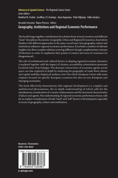 The book aims to present "traditional features" of regional science (as geographical concepts and institutions), as well as relatively new topics such as innovation and agglomeration economies. In particular it demonstrates that, contrary to what has been argued by recent economics literature, both geography and institutions (or culture) are relevant for local development. In fact, these phenomena, along with the movement of goods and workers, are among the main reasons for persisting development differentials. These intriguing relationships are at the heart of the analysis presented in this book and form the conceptual basis for a promising institutional approach to economic geography.