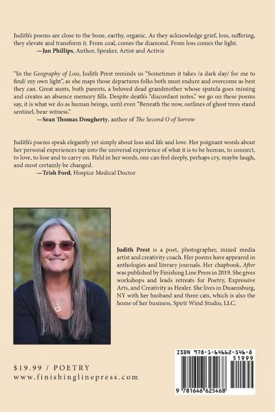 Judith's poems are close to the bone, earthy, organic. As they acknowledge grief, loss, suffering, they elevate and transform it. From coal, comes the diamond. From loss comes the light. -Jan Phillips, Author, Speaker, Artist and Activis "In the Geography of Loss, Judith Prest reminds us "Sometimes it takes /a dark day/ for me to find/ my own light", as she maps those departures folks both must endure and overcome as best they can. Great aunts, both parents, a beloved dead grandmother whose spatula goes missing and creates an absence memory fills. Despite death's "discordant notes," we go on these poems say, it is what we do as human beings, until even "Beneath the now, outlines of ghost trees stand sentinel, bear witness." -Sean Thomas Dougherty, author of The Second O of Sorrow Judith's poems speak elegantly yet simply about loss and life and love. Her poignant words about her personal experiences tap into the universal experience of what it is to be human, to connect, to love, to lose and to carry on. Held in her words, one can feel deeply, perhaps cry, maybe laugh, and most certainly be changed. -Trish Ford, Hospice Medical Doctor