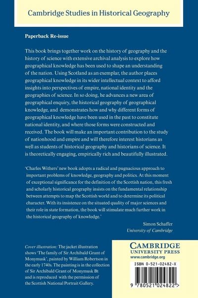 Charles Withers' book brings together work on the history of geography and the history of science with extensive archival analysis to explore how geographical knowledge has been used to shape an understanding of the nation. Using Scotland as an exemplar, the author places geographical knowledge in its wider intellectual context to afford insights into perspectives of empire, national identity and the geographies of science. In so doing, he advances a new area of geographical enquiry, the historical geography of geographical knowledge, and demonstrates how and why different forms of geographical knowledge have been used in the past to constitute national identity, and where those forms were constructed and received. The book will make an important contribution to the study of nationhood and empire and will therefore interest historians, as well as students of historical geography and historians of science. It is theoretically engaging, empirically rich and beautifully illustrated.