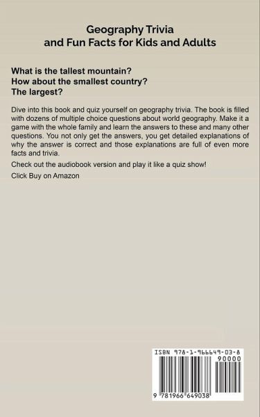 Learn about geography of the world with this fun trivia game! What is the tallest mountain? How about the smallest country? The largest? Dive into this book and quiz yourself on geography trivia. The book is filled with multiple choice questions about world geography. Make it a game with the whole family and learn the answers to these and many other questions. You not only get the answers, you get detailed explanations of why the answer is correct and those explanations are full of even more facts and trivia. Check out the audiobook version and play it like a quiz show!