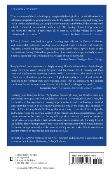 Geoliturgy and Ecological Crisis: The Spiritual Practice of Caring for Creation examines sources and select practices within Christian tradition-Scripture, the Nicene Creed, the Eucharist, and fasting-from an ecological perspective in order to develop a practical spirituality for living in an ecologically responsible way in the world. This spirituality, which Jeffrey S. Lamp labels Geoliturgy, describes a way to read the Bible ecologically and to understand the doctrinal content of the Nicene Creed in ecological terms. Lamp then examines the Eucharist and fasting as liturgical and devotional practices that form the structure of a spirituality that extends from church services into the daily lives of the faithful. The resulting vision of this study is the reclamation of the biblical mandate for human beings to function as benevolent priestly co-rulers with God in creation to prepare creation to become the dwelling place of God.