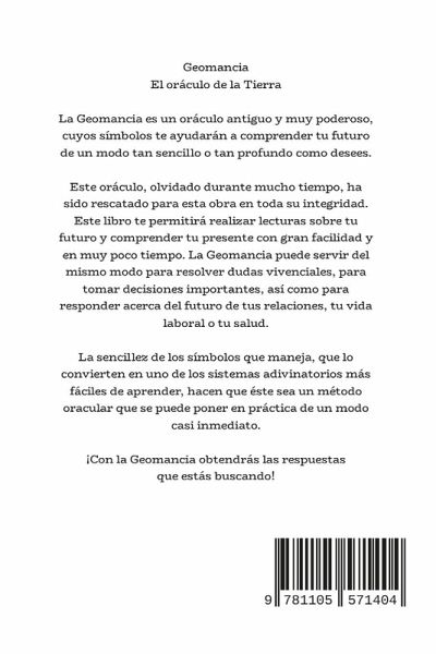 El oráculo de la Tierra La Geomancia es un oráculo antiguo y muy poderoso, cuyos símbolos te ayudarán a comprender tu futuro de un modo tan sencillo o tan profundo como desees. Este oráculo, olvidado durante mucho tiempo, ha sido rescatado para esta obra en toda su integridad. Este libro te permitirá realizar lecturas sobre tu futuro y comprender tu presente con gran facilidad y en muy poco tiempo. La Geomancia puede servir del mismo modo para resolver dudas vivenciales, para tomar decisiones importantes, así como para responder acerca del futuro de tus relaciones, tu vida laboral o tu salud. La sencillez de los símbolos que maneja, que lo convierten en uno de los sistemas adivinatorios más fáciles de aprender, hacen que éste sea un método oracular que se puede poner en práctica de un modo casi inmediato. Este libro: ¿ Explica el significado adivinatorio de las dieciséis figuras geománticas. ¿ Presenta completas tablas de correspondencias, que permiten afinar los significados de las figuras geománticas y ayudan a contestar a preguntas muy concretas que no son cubiertas por otros sistemas adivinatorios. ¿ Da instrucciones detalladas acerca de cómo consultar el oráculo, proponiendo tanto los sistemas tradicionales como otros más novedosos. ¿ Señala, paso a paso, cómo se construye un escudo o carta geomántica. ¿ Dedica un extenso espacio a la interpretación del escudo, con un método que permite hacer lecturas más o menos profundas según los deseos del consultante. ¿ Explica varios métodos de meditación geomántica, que permitirán mejorar la efectividad del oráculo. Con la Geomancia obtendrás respuestas que estabas buscando.