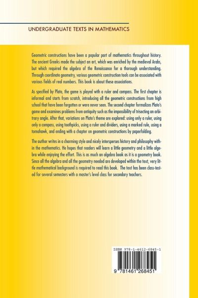Geometric constructions have been a popular part of mathematics throughout history. The ancient Greeks made the subject an art, which was enriched by the medieval Arabs but which required the algebra of the Renaissance for a thorough understanding. Through coordinate geometry, various geometric construction tools can be associated with various fields of real numbers. This book is about these associations. As specified by Plato, the game is played with a ruler and compass. The first chapter is informal and starts from scratch, introducing all the geometric constructions from high school that have been forgotten or were never seen. The second chapter formalizes Plato's game and examines problems from antiquity such as the impossibility of trisecting an arbitrary angle. After that, variations on Plato's theme are explored: using only a ruler, using only a compass, using toothpicks, using a ruler and dividers, using a marked rule, using a tomahawk, and ending with a chapter on geometric constructions by paperfolding. The author writes in a charming style and nicely intersperses history and philosophy within the mathematics. He hopes that readers will learn a little geometry and a little algebra while enjoying the effort. This is as much an algebra book as it is a geometry book. Since all the algebra and all the geometry that are needed is developed within the text, very little mathematical background is required to read this book. This text has been class tested for several semesters with a master's level class for secondary teachers.