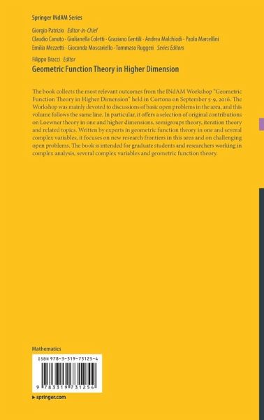The book collects the most relevant outcomes from the INdAM Workshop "Geometric Function Theory in Higher Dimension" held in Cortona on September 5-9, 2016. The Workshop was mainly devoted to discussions of basic open problems in the area, and this volume follows the same line. In particular, it offers a selection of original contributions on Loewner theory in one and higher dimensions, semigroups theory, iteration theory and related topics. Written by experts in geometric function theory in one and several complex variables, it focuses on new research frontiers in this area and on challenging open problems. The book is intended for graduate students and researchers working in complex analysis, several complex variables and geometric function theory.