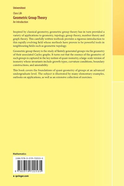 Inspired by classical geometry, geometric group theory has in turn provided a variety of applications to geometry, topology, group theory, number theory and graph theory. This carefully written textbook provides a rigorous introduction to this rapidly evolving field whose methods have proven to be powerful tools in neighbouring fields such as geometric topology.
