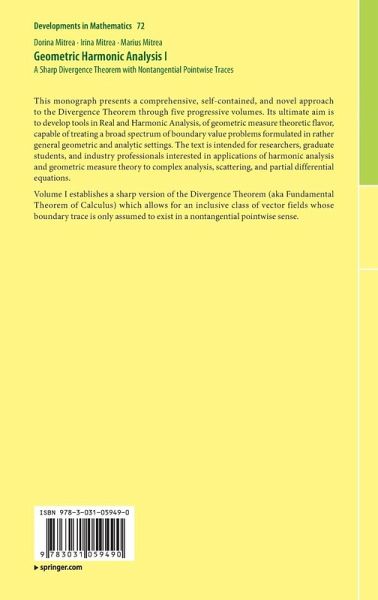 Prefacing this Series.- Statement of Main Results Concerning the Divergence Theorem.- Examples, Counterexamples, and Additional Perspectives.- Measure Theoretical and Topological Rudiments.- Sets of Locally Finite Perimeter and Other Categories of Euclidean Sets.- Tools from Harmonic Analysis.- Quasi-Metric Spaces and Spaces of Homogenous Type.- Open Sets with Locally Finite Surface Measures and Boundary Behavior.- Proofs of Main Results Pertaining to the Divergence Theorem.- II: Function Spaces Measuring Size and Smoothness on Rough Sets.- Preliminary Functional Analytic Matters.- Selected Topics in Distribution Theory.- Hardy Spaces on Ahlfors Regular Sets.- Morrey-Campanato Spaces, Morrey Spaces, and Their Pre-Duals on Ahlfors Regular Sets.- Besov and Triebel-Lizorkin Spaces on Ahlfors Regular Sets.- Boundary Traces from Weighted Sobolev Spaces in Besov Spaces.- Besov and Triebel-Lizorkin Spaces in Open Sets.- Strong and Weak Normal Boundary Traces of Vector Fields in Hardy and Morney Spaces.- Sobolev Spaces on the Geometric Measure Theoretic boundary of Sets of Locally Finite Perimeter.- III: Integral Representations Calderón-Zygmund Theory, Fatou Theorems, and Applications to Scattering.- Integral Representations and Integral Identities.- Calderón-Zygmund Theory on Uniformly Rectifiable Sets.- Quantitative Fatou-Type Theorems in Arbitrary UR Domains.- Scattering by Rough Obstacles.- IV: Boundary Layer Potentials on Uniformly Rectifiable Domains, and Applications to Complex Analysis.- Layer Potential Operators on Lebesgue and Sobolev Spaces.- Layer Potential Operators on Hardy, BMO, VMO, and Hölder Spaces.- Layer Potential Operators on Calderón, Morrey-Campanato, and Morrey Spaces.- Layer Potential Operators Acting from Boundary Besov and Triebel-Lizorkin Spaces.- Generalized double Layers in Uniformly Rectifiable Domains.- Green Formulas and Layer Potential Operators for the Stokes System.- Applications to Analysis in Several Complex Variables.- V: Fredholm Theory and Finer Estimates for Integral Operators, with Applications to Boundary Problems.- Abstract Fredholm Theory.- Distinguished Coefficient Tensors.- Failure of Fredholm Solvability for Weakly Elliptic Systems.- Quantifying Global and Infinitesimal Flatness.- Norm Estimates and Invertibility Results for SIO's on Unbounded Boundaries.- Estimating Chord-Dot-Normal SIO's on Domains with Compact Boundaries.- The Radon-Carleman Problem.- Fredholmness and Invertibility of Layer Potentials on Compact Boundaries.- Green Functions and Uniqueness for Boundary Problems for Second-Order Systems.- Green Functions and Poisson Kernels for the Laplacian.- Boundary Value Problems for Elliptic Systems in Rough Domains.