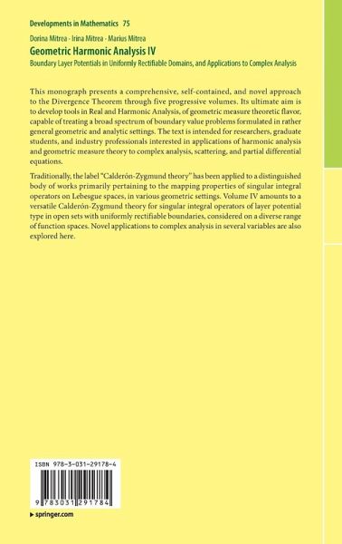Traditionally, the label "Calderón-Zygmund theory" has been applied to a distinguished body of works primarily pertaining to the mapping properties of singular integral operators on Lebesgue spaces, in various geometric settings. Volume IV amounts to a versatile Calderón-Zygmund theory for singular integral operators of layer potential type in open sets with uniformly rectifiable boundaries, considered on a diverse range of function spaces. Novel applications to complex analysis in several variables are also explored here.