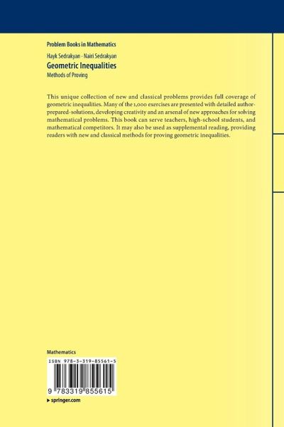 This unique collection of new and classical problems provides full coverage of geometric inequalities. Many of the 1,000 exercises are presented with detailed author-prepared-solutions, developing creativity and an arsenal of new approaches for solving mathematical problems. This book can serve teachers, high-school students, and mathematical competitors. It may also be used as supplemental reading, providing readers with new and classical methods for proving geometric inequalities.