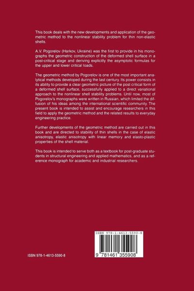 PREFACE This book deals with the new developments and applications of the geometric method to the nonlinear stability problem for thin non-elastic shells. There are no other published books on this subject except the basic ones of A. V. Pogorelov (1966,1967,1986), where variational principles defined over isometric surfaces, are postulated, and applied mainly to static and dynamic problems of elastic isotropic thin shells. A. V. Pogorelov (Harkov, Ukraine) was the first to provide in his monographs the geometric construction of the deformed shell surface in a post-critical stage and deriving…mehr