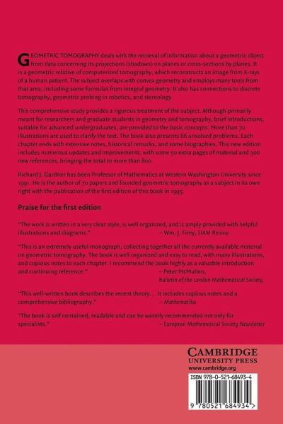 Preface to the second edition Preface 0. Background material 1. Parallel X-rays of planar convex bodies 2. Parallel X-rays in n dimensions 3. Projections and projection functions 4. Projection bodies and volume inequalities 5. Point X-rays 6. Chord functions and equichordal problems 7. Sections, section functions, and point X-rays 8. Intersection bodies and volume inequalities 9. Estimates from projection and section functions Appendix A. Mixed volumes and dual mixed volumes Appendix B. Inequalities Appendix C. Integral transforms References Notation Author index Subject index.