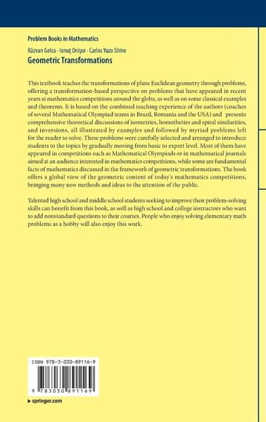 This textbook teaches the transformations of plane Euclidean geometry through problems, offering a transformation-based perspective on problems that have appeared in recent years at mathematics competitions around the globe, as well as on some classical examples and theorems. It is based on the combined teaching experience of the authors (coaches of several Mathematical Olympiad teams in Brazil, Romania and the USA) and presents comprehensive theoretical discussions of isometries, homotheties and spiral similarities, and inversions, all illustrated by examples and followed by myriad problems left for the reader to solve. These problems were carefully selected and arranged to introduce students to the topics by gradually moving from basic to expert level. Most of them have appeared in competitions such as Mathematical Olympiads or in mathematical journals aimed at an audience interested in mathematics competitions, while some are fundamental facts of mathematics discussed in the framework of geometric transformations. The book offers a global view of the geometric content of today's mathematics competitions, bringing many new methods and ideas to the attention of the public.