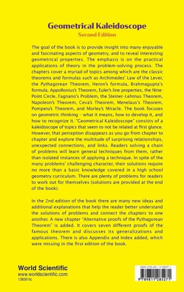 The goal of the book is to provide insight into many enjoyable and fascinating aspects of geometry, and to reveal interesting geometrical properties. The emphasis is on the practical applications of theory in the problem-solving process. The chapters cover a myriad of topics among which are the classic theorems and formulas such as Archimedes' Law of the Lever, the Pythagorean Theorem, Heron's formula, Brahmagupta's formula, Appollonius's Theorem, Euler's line properties, the Nine-Point Circle, Fagnano's Problem, the Steiner-Lehmus Theorem, Napoleon's Theorem, Ceva's Theorem, Menelaus's Theorem, Pompeiu's Theorem, and Morley's Miracle. The book focuses on geometric thinking - what it means, how to develop it, and how to recognize it. "Geometrical Kaleidoscope" consists of a kaleidoscope of topics that seem to not be related at first glance. However, that perception disappears as you go from chapter to chapter and explore the multitude of surprising relationships, unexpected connections, and links. Readers solving a chain of problems will learn from them general techniques, rather than isolated instances of the application of a technique. In spite of the many problems' challenging character, their solutions require no more than a basic knowledge covered in a high school geometry curriculum. There are plenty of problems for readers to work out for themselves (solutions are provided at the end of the book). In the 2nd edition of the book there are many new ideas and additional explanations that help the reader better understand the solutions of problems and connect the chapters to one another. A new chapter "Alternative proofs of the Pythagorean Theorem" is added. It covers seven different proofs of the famous theorem and discusses its generalizations and applications. There is also Appendix and Index added, which were missing in the first edition of the book.