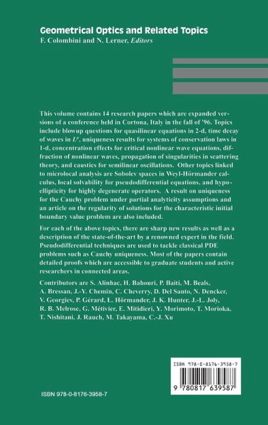Blowup of small data solutions for a class of quasilinear wave equations in two dimensions: an outline of the proof.- Concentration effects in critical nonlinear wave equation and scattering theory.- Lower semicontinuity of weighted path length in BV.- Time decay of Lp norms for solutions of the wave equation on exterior domains.- Sobolev embeddings in Weyl-Hörmander calculus.- About the Cauchy problem for a system of conservation laws.- Global existence of the solutions and formation of singularities for a class of hyperbolic systems.- A class of solvable operators.- On the uniqueness of the Cauchy problem under partial analyticity assumptions.- Nonlinear wave diffraction.- Caustics for dissipative semilinear oscillations.- Geometric optics and the bottom of the spectrum.- Hypoellipticity for a class of infinitely degenerate elliptic operators.- Regularity of solutions to characteristic boundary value problem for symmetric systems.