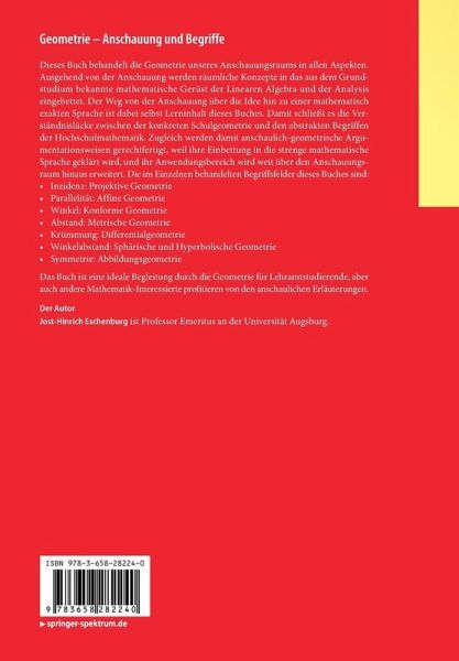 Dieses Buch behandelt die Geometrie des Anschauungsraums in allen ihren Aspekten. Wie in jedem Teilgebiet der Mathematik geht es darum, das Verborgene auf das Offensichtliche zurückzuführen; die Besonderheit der Geometrie ist, dass das Offensichtliche manchmal im wörtlichen Sinne vor Augen liegt.Ausgehend von der Anschauung werden räumliche Konzepte in das bereits vorhandene mathematische Gerüst der Linearen Algebra und der Analysis eingebettet. Der Weg von der Anschauung zur mathematisch exakten Sprache ist selbst Lerninhalt dieses Buches. Damit soll eine oft beklagte Verstehenslücke geschlossen werden, die sich zwischen der anschaulichen Vorschul- und Schul- Geometrie und den abstrakten Begriffen der Linearen Algebra und Analysis auftut. Zugleich werden damit anschaulich-geometrische Argumentationsweisen gerechtfertigt, weil ihre Einbettung in die strenge mathematische Sprache geklärt wurde.Die Begriffe der Geometrie sind von ganz unterschiedlicher Natur; sie bezeichnen sozusagen verschiedene Schichten geometrischen Denkens: Manche Argumente verwenden nur Begriffe wie Punkt, Gerade und Inzidenz, andere benötigen Winkel und Abstände, wieder andere Symmetrie-Überlegungen. Jedes dieser Begriffsfelder bestimmt ein eigenes Teilgebiet der Geometrie und ein eigenes Kapitel dieses Buches, mit Ausnahme des letztgenannte Begriffsfelds "Symmetrie", das alle anderen durchzieht: - Inzidenz: Projektive Geometrie - Parallelität: Affine Geometrie - Winkel: Konforme Geometrie - Abstand: Metrische Geometrie - Krümmung: Differentialgeometrie - Winkel als Abstandsmaß: Sphärische und Hyperbolische Geometrie - Symmetrie: Abbildungsgeometrie.Die im Anschauungsraum erworbene mathematische Erfahrung lässt sich ohne Mühe mit Hilfe des Vektorraum-Begriffs auf sehr viel abstraktere Situationen übertragen. Die Verallgemeinerungen über die Anschauung hinausweisen in zwei Richtungen: Erweiterung des Zahlbegriffs und Überschreiten der drei anschaulichen Dimensionen.