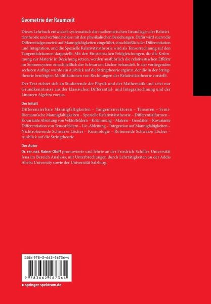 Dieses Lehrbuch entwickelt systematisch die mathematischen Grundlagen der Relativitätstheorie und verbindet diese mit den physikalischen Beziehungen. Dafür wird zuerst die Differentialgeometrie auf Mannigfaltigkeiten eingeführt, einschließlich der Differentiation und Integration, und die Spezielle Relativitätstheorie wird als Tensorrechnung auf den Tangentialräumen dargestellt. Mit den Einstein'schen Feldgleichungen, die die Krümmung zur Materie in Beziehung setzen, werden ausführlich die relativistischen Effekte im Sonnensystem einschließlich der Schwarzen Löcher behandelt. In der vorliegenden sechsten Auflage wurde ein Ausblick auf die Stringtheorie ergänzt, der die in der Stringtheorie benötigten Modifikationen von Rechnungen der Relativitätstheorie vorstellt.