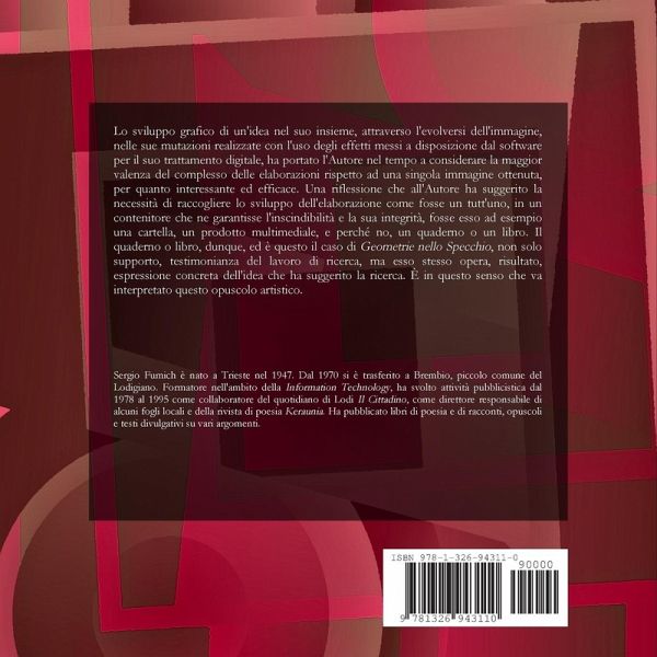 Lo sviluppo grafico di un'idea nel suo insieme, attraverso l'evolversi dell'immagine, nelle sue mutazioni realizzate con l'uso degli effetti messi a disposizione dal software per il suo trattamento digitale, ha portato l'Autore nel tempo a considerare la maggior valenza del complesso delle elaborazioni rispetto ad una singola immagine ottenuta, per quanto interessante ed efficace. Una riflessione che all'Autore ha suggerito la necessità di raccogliere lo sviluppo dell'elaborazione come fosse un tutt'uno, in un contenitore che ne garantisse l'inscindibilità e la sua integrità, fosse esso ad esempio una cartella, un prodotto multimediale, e perché no, un quaderno o un libro. Il quaderno o libro, dunque, ed è questo il caso di "Geometrie nello Specchio", non solo supporto, testimonianza del lavoro di ricerca, ma esso stesso opera, risultato, espressione concreta dell'idea che ha suggerito la ricerca. È in questo senso che va interpretato questo opuscolo artistico.