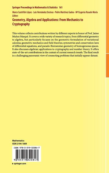 1 W. Batat, P. M. Gadea, J. A. Oubiña, A survey on homogeneousstructures on the classical hyperbolic spaces.- 2 A. Bejancu, On the (1 + 3) threading of spacetime.- 3 M. Brozos-Vázquez, E.Calviño-Louzao, E. García-Río, R. Vázquez-Lorenzo, Local structure ofself-dual gradient Yamabe solitons.- 4 G. Calvaruso, The prescribed curvature problem in low dimension.-5 M.Castrillón López, P. L. García, Euler-Poincare reduction by a subgroup ofsymmetries as an optimal control problem.- 6 M. Castrillón López, T. S. Ratiu, Morse families andLagrangian submanifolds.- 7 R. Durán Díaz, L. Hernández Encinas, Special primes: properties and applications.-8 F. Etayo, Rotation Minimizing vectorfields and frames in Riemannian manifolds.- 9 R. Ferreiro Pérez, Local anomaly cancellation and equivariantcohomology of jet bundles.- 10 A. Fúster-Sabater, F. Montoya Vitini, Classes of nonlinear filters for streamciphers.- 11 V. Gayoso Martínez, L. Hernández Encinas, A.Martín Muñoz, Implementation of cryptographic algorithms for ellipticcurves.- 12 R.Hernández-Amador, J. Monterde, J. Vallejo, Supermanifolds, symplectic geometry and curvature.-13 A. Marcelo, F. Marcelo, C. Rodríguez, Prime submodules and symmetric algebras.- 14 A. Martín del Rey, G. Rodríguez Sánchez, Application to cybersecurityof the stability theory of the systems of ordinary differential equations.- 15I. V. Mykytyuk, On the non-triviality of the eight-form T4(w) on manifolds with a Spin(9)-structure.- 16 A. Peinado, Flaws in the applicationof Number Theory in Key Distribution Schemes for Multicast Networks.- 17 L. Pozo, E. Rosado, Einstein-HilbertLagrangian induced on the linear frame bundle.
