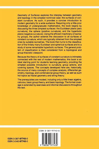 1. The Euclidean Plane.- 1.1 Approaches to Euclidean Geometry.- 1.2 Isometries.- 1.3 Rotations and Reflections.- 1.4 The Three Reflections Theorem.- 1.5 Orientation-Reversing Isometries.- 1.6 Distinctive Features of Euclidean Geometry.- 1.7 Discussion.- 2. Euclidean Surfaces.- 2.1 Euclid on Manifolds.- 2.2 The Cylinder.- 2.3 The Twisted Cylinder.- 2.4 The Torus and the Klein Bottle.- 2.5 Quotient Surfaces.- 2.6 A Nondiscontinuous Group.- 2.7 Euclidean Surfaces.- 2.8 Covering a Surface by the Plane.- 2.9 The Covering Isometry Group.- 2.10 Discussion.- 3. The Sphere.- 3.1 The Sphere S2 in ?3.- 3.2 Rotations.- 3.3 Stereographic Projection.- 3.4 Inversion and the Complex Coordinate on the Sphere.- 3.5 Reflections and Rotations as Complex Functions.- 3.6 The Antipodal Map and the Elliptic Plane.- 3.7 Remarks on Groups, Spheres and Projective Spaces.- 3.8 The Area of a Triangle.- 3.9 The Regular Polyhedra.- 3.10 Discussion.- 4. The Hyperbolic Plane.- 4.1 Negative Curvature and the Half-Plane.- 4.2 The Half-Plane Model and the Conformai Disc Model.- 4.3 The Three Reflections Theorem.- 4.4 Isometries as Complex Functions.- 4.5 Geometric Description of Isometries.- 4.6 Classification of Isometries.- 4.7 The Area of a Triangle.- 4.8 The Projective Disc Model.- 4.9 Hyperbolic Space.- 4.10 Discussion.- 5. Hyperbolic Surfaces.- 5.1 Hyperbolic Surfaces and the Killing-Hopf Theorem.- 5.2 The Pseudosphere.- 5.3 The Punctured Sphere.- 5.4 Dense Lines on the Punctured Sphere.- 5.5 General Construction of Hyperbolic Surfaces from Polygons.- 5.6 Geometric Realization of Compact Surfaces.- 5.7 Completeness of Compact Geometric Surfaces.- 5.8 Compact Hyperbolic Surfaces.- 5.9 Discussion.- 6. Paths and Geodesies.- 6.1 Topological Classification of Surfaces.- 6.2 Geometric Classification ofSurfaces.- 6.3 Paths and Homotopy.- 6.4 Lifting Paths and Lifting Homotopies.- 6.5 The Fundamental Group.- 6.6 Generators and Relations for the Fundamental Group.- 6.7 Fundamental Group and Genus.- 6.8 Closed Geodesic Paths.- 6.9 Classification of Closed Geodesic Paths.- 6.10 Discussion.- 7. Planar and Spherical Tessellations.- 7.1 Symmetric Tessellations.- 7.2 Conditions for a Polygon to Be a Fundamental Region.- 7.3 The Triangle Tessellations.- 7.4 Poincaré's Theorem for Compact Polygons.- 7.5 Discussion.- 8. Tessellations of Compact Surfaces.- 8.1 Orbifolds and Desingularizations.- 8.2 Prom Desingularization to Symmetric Tessellation.- 8.3 Desingularizations as (Branched) Coverings.- 8.4 Some Methods of Desingularization.- 8.5 Reduction to a Permutation Problem.- 8.6 Solution of the Permutation Problem.- 8.7 Discussion.- References.