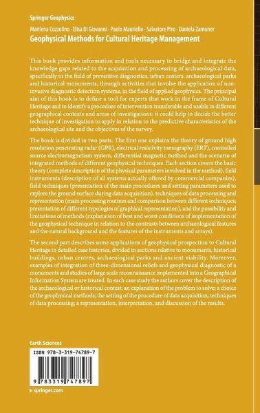 The book is divided in two parts. The first one explains the theory of ground high resolution penetrating radar (GPR), electrical resistivity tomography (ERT),controlled source electromagnetism system, differential magnetic method and the scenario of integrated methods of different geophysical techniques. Each section covers the basic theory (complete description of the physical parameters involved in the method), field instruments (description of all systems actually offered by commercial companies), field techniques (presentation of the main procedures and setting parameters used to explore the ground surface during data acquisition), techniques of data processing and representation (main processing routines and comparison between different techniques; presentation of different typologies of graphical representation), and the possibility and limitations of methods (explanation of best and worst conditions of implementation of the geophysical technique in relation to the contrasts between archaeological features and the natural background and the features of the instruments and arrays).